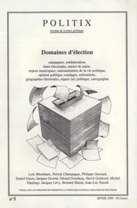 Domaines d'élection n° 5, 1989/1 - pagesPages 3 à 3Domaines d'électionPages 7 à 10Le renouvellement des études sur les campagnes électoralesPar Jacques GerstléPages 11 à 16Savoir-faire et mobilisation des croyances dans le métier de mairePar Philippe GarraudPages 17 à 24Enjeux électoraux, enjeux municipaux - Entretien avec Daniel GaxiePages 25 à 46Quand les sondages se débattent - Débat entre Patrick Champagne, Bernard Manin et Jean-Luc ParodiPar Patrick Champagne, Bernard Manin, Jean-Luc ParodiPages 47 à 49Mémoires d'estimateurPar Gérard GrunbergPages 50 à 55Les sondages d'opinion : bibliographiePar Loïc BlondiauxPages 57 à 6870 ans de géographie électoralePar Hervé GuillorelPages 69 à 73Invitation au voyagePar Jacques LévyPages 74 à 76Les démiurges de l'introspection cartographiquePar Michel HastingsPages 77 à 86Sur le développement politique en GrècePar Jean-Marie DemaldentPages 87 à 88Le CURRAPPages 89 à 90Mayer (Nonna), Perrineau (Pascal), Le Front National à découvert, Presses de la FNSP, 1989Par Jean-Philippe HeurtinPages 90 à 92Sineau (Mariette), Des femmes en politique, Paris, Economica, 1988Par Jean-Baptiste LegavrePages 92 à 93Abélès (Marc), Jours tranquilles en 89. Ethnologie politique d'un département français, Paris, Editions Odile Jacob, 1989Par Jean-Louis BriquetPages 93 à 95Mabileau (Albert), Moyser (George), Parry (Geraint), Quantin (Patrick), dir., Les citoyens et la politique locale. Comment participent les Britanniques et les Français, Paris, Pedone, 1988Par Sylvain BourmeauPages 95 à 96Habermas (Jürgen), L'espace public. Archéologie de la publicité comme dimension constitutive de la société bourgeoise, Paris, Payot, réed. 1988Par Danny TromPages 97 à 102Revue des revues