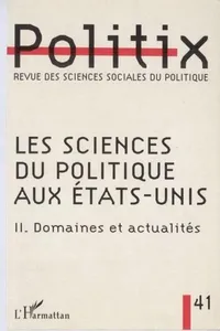 Les sciences du politique aux États-unis II. Domaines et actualitésn° 41, 1998/1 - pagesPages 5 à 5ÉditorialPages 7 à 32Pour une cartographie de la politique contestatairePar Doug McAdam, Sidney Tarrow, Charles TillyPages 33 à 81La science politique américaine face aux défis du féminismePar Susan J. Carroll, Linda M. G. ZerilliPages 82 à 122L'analyse économique des choix électoraux (II)Par Patrick LehinguePages 123 à 175Les nouvelles perspectives de la recherche sur l'opinion publiquePar Paul SnidermanPages 176 à 194Les relations internationales dans la science politique aux Etats-UnisPages 195 à 223L'Advocacy Coalition Framework. Une contribution au renouvellement des études de politiques publiques ?Par Henri Bergeron, Yves Surel, Jérôme Valluy
