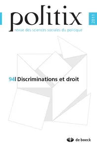 Discriminations et droit n° 94, 2011/2 - pagesPages 3 à 6ÉditorialPages 7 à 34La discrimination, de la qualification juridique à l'outil sociologiquePar Laure Bereni, Vincent-Arnaud ChappePages 35 à 57Illégitimer des distinctions en droitPar Juliette RennesPages 59 à 80De la mobilisation du droit à la réalisation du droitPar Marta Roca i EscodaPages 81 à 105En quête d'une introuvable action antidiscriminatoirePar Joan Stavo-DebaugePages 107 à 130Le cadrage juridique, une ressource politique ?Par Vincent-Arnaud ChappePages 131 à 152Victimes dans l'ombre de la loiPar Kristin Bumiller, Laure Bereni, Vincent-Arnaud Chappe, Séverine Lacalmontie, Francis CorsonPages 153 à 178De la ressource intellectuelle à la cause politiquePar Victor ColletPages 179 à 201La cause de l'intelligencePar Wilfried LignierPages 203 à 206Gilbert Claude, Henry Emmanuel (dir.) Comment se construisent les problèmes de santé publique, Paris, La Découverte, coll. « Recherches », 2010, 290 p., bibliographie.Par Daniel BenamouzigPages 207 à 210Geiling Heiko (dir.), Die Krise der SPD. Autoritäre und partizipatorische Demokratie, 2e éd., Münster-Hambourg-London, LIT Verlag, 2010 (1re éd. 2009), 368 p.Par Karim FertikhPages 211 à 216Lemieux (Cyril), Le devoir et la grâce, Paris, Economica, coll. « Études sociologiques », 2009, 246 p., index, bibliographie.Par Olivier RoueffPages 216 à 219Zalc (Claire), Melting Shops. Une histoire des commerçants étrangers en France, Paris, Perrin, coll. « Pour l’Histoire », 2010, 330 p., bibliographie.Par Caroline Frau