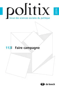 Faire campagne n° 113, 2016/1 - pagesPages 3 à 4ÉditorialPages 5 à 16Pour une sociologie des répertoires d’actions électoralesPar Clément Desrumaux, Rémi LefebvrePages 17 à 42Des maires en campagne(s)Par Sébastien VignonPages 43 à 64Une approche configurationnelle des styles de campagnePar Clément DesrumauxPages 65 à 89Le « PT light » en campagnePar Camille GoirandPages 91 à 115La modernisation du porte-à-porte au Parti socialiste. Réinvention d’un répertoire de campagne et inerties militantesPar Rémi LefebvrePages 117 à 139Les représentant.e.s d’intérêt et la campagne présidentielle de 2012. Rapports au politique et formes de coopération avec les candidat.e.sPar Guillaume Courty, Julie GervaisPages 141 à 169Politisations différentielles et acculturations mutuelles en contexte autoritairePar Mounia Bennani-ChraïbiPages 171 à 199Les « originaires » en politiquePar Lucie BargelPages 201 à 222Le député débutantPar Martin BalogePages 223 à 227Pasquali (Paul), Passer les frontières sociales. Comment les « filières d’élite » entrouvrent leurs portes, Paris, Fayard, 2014, 464 p.Par Lorenzo Barrault-StellaPages 227 à 230Navarre (Maud), Devenir élue. Genre et carrière politique, Rennes, Presses universitaires de Rennes, coll. « Res publica », 2015, 258 p.Par Hugo BouvardPages 230 à 234Soriano (Éric), La fin des Indigènes en Nouvelle-Calédonie. Le colonial à l’épreuve du politique, 1946-1976, Paris, Karthala ; Montpellier, Maison des Sciences de l’Homme, coll. « Karapaa », 2014, 321 p., bibliographiePar Camille MazéPages 234 à 238Jacquemart (Alban), Les hommes dans les mouvements féministes. Socio-histoire d’un engagement improbable, Rennes, Presses universitaires de Rennes, 2015, 324 p., bibliographie, index et annexes.Par Anne Verjus