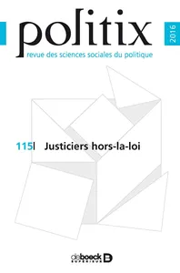 Justiciers hors-la-loi n° 115, 2016/3 - pagesPages 3 à 5ÉditorialPages 7 à 33Violer la loi pour maintenir l’ordrePar Gilles Favarel-Garrigues, Laurent GayerPages 35 à 55Violence du quotidien et vigilantisme féminin dans les bidonvilles de BombayPar Atreyee SenPages 57 à 78Engagements sécuritaires et féminisation du vigilantisme en Afrique du SudPar Laurent FourchardPages 79 à 102Entre suprématie blanche et cybersécuritéPar Damien SimonneauPages 103 à 125« Vigilar y Limpiar ». Identification et auto-justice dans le Michoacán, MexiquePar Romain Le Cour GrandmaisonPages 127 à 153Le vigilantisme numérique, entre dénonciation et sanctionPar Benjamin LoveluckPages 155 à 177Des agents de l’État interchangeables ?Par Sylvain Laurens, Delphine SerrePages 179 à 200Retournement et reproduction : l’usage des questions sexuelles dans la campagne municipale d’Alain Juppé (2013-2014)Par Clément Arambourou, Fanny BugnonPages 201 à 224La construction d’un « droit social européen »Par Karim FertikhPages 225 à 228Aït-Aoudia (Myriam), L’expérience démocratique en Algérie (1988-1992). Apprentissages politiques et changement de régime, Paris, Presses de Sciences Po, 2015, 346 p.Par Cédric PellenPages 229 à 232Belot (Robert), Lucien Rebatet. Le fascisme comme contre-culture, Rennes, Presses universitaires de Rennes, coll. « Histoire », 2015, 440 p., réédition refondue, revue et augmentée de Lucien Rebatet, un itinéraire fasciste (Paris, Le Seuil, 1994)Par Tristan RouquetPages 233 à 236Cadiou (Stéphane), dir., Gouverner sous pression ? La participation des groupes d’intérêt aux affaires territoriales, Paris, Librairie générale de droit et de jurisprudence, coll. « Droit et Société », 2016, 310 p.Par Tommy Tran