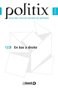 En bas à droite n° 122, 2018/2 - pagesPages 3 à 5ÉditorialPages 9 à 31En bas à droitePar Amélie Beaumont, Raphaël Challier, Guillaume LejeunePages 33 à 56S’engager « du côté des gens bien »Par Raphaël ChallierPages 57 à 78« Déjà nous »Par Benoît CoquardPages 79 à 105Tirer parti de l’ordre établi ?Par Amélie BeaumontPages 107 à 130Les chauffeurs de taxi face à UberPar Guillaume LejeunePages 131 à 161Des « ouvriers en costume-cravate » ?Par Stéphane Latté, Simon HupfelPages 165 à 185La mise en place d’un système d’orientation scolaire aux lendemains de Mai-Juin 68 : entre rénovation pédagogique et reflux conservateur (1968-1973)Par Paul LehnerPages 187 à 220« Mai 68 » : fenêtre d’opportunité pour un haut fonctionnaire au placardPar Christelle Dormoy-RajramananPages 221 à 225Zalc (Claire), Dénaturalisés. Les retraits de nationalité sous Vichy, Paris, Seuil, coll. « L’univers historique », 2016, 400 p.Par Barbara Bauduin, Célia KerenPages 226 à 229Plumauzille (Clyde), Prostitution et Révolution. Les femmes publiques dans la cité républicaine (1789-1804), Paris, Champ Vallon, coll. « La chose publique », 2016, 397 p.Par Maeva Le RoyPages 230 à 233Marichalar (Pascal), Qui a tué les verriers de Givors ? Une enquête de sciences sociales, Paris, La Découverte, coll. « L’envers des faits », 2017, 256 p.Par Paul HobeikaPages 234 à 237Menger (Pierre-Michel), Paye (Simon), dir., Big data et traçabilité numérique. Les sciences sociales face à la quantification massive des individus, Paris, Collège de France, 2017, 218 p.Par Julien BoyadjianPages 238 à 241Baudot (Pierre-Yves), Revillard (Anne), dir., L’État des droits. Politique des droits et pratiques des institutions, Paris, Presses de Sciences Po, coll. « Académique », 2015, 256 p.Par Myriam Ahnich